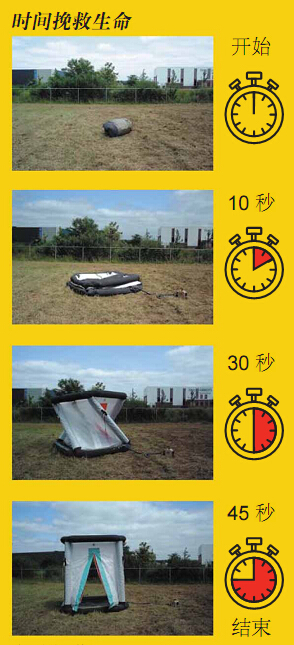 - 用气缸或鼓风机可在几秒内快速架起帐篷