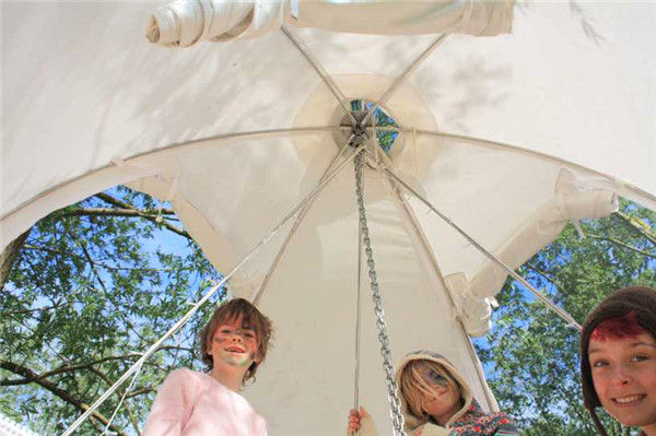 帐篷内部放置了一块圆形木质地板,使露营者躺着、或坐着舒适,一些衣服和鞋子可以搁置在地板上面,保持了帐篷内部的清洁、干燥。