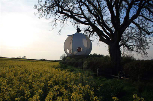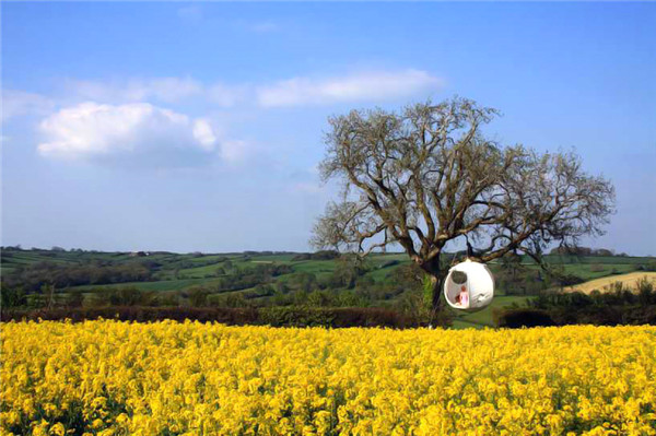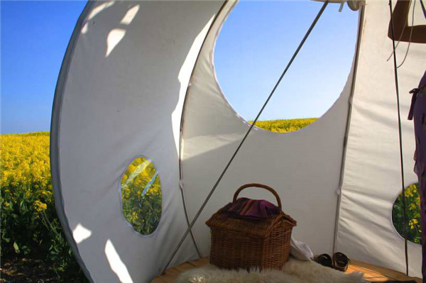 球形帐篷的外表面,一部分是采用透明的塑料膜,一部分是开口窗帘,确保帐篷内部有充足的阳光和新鲜的空气。