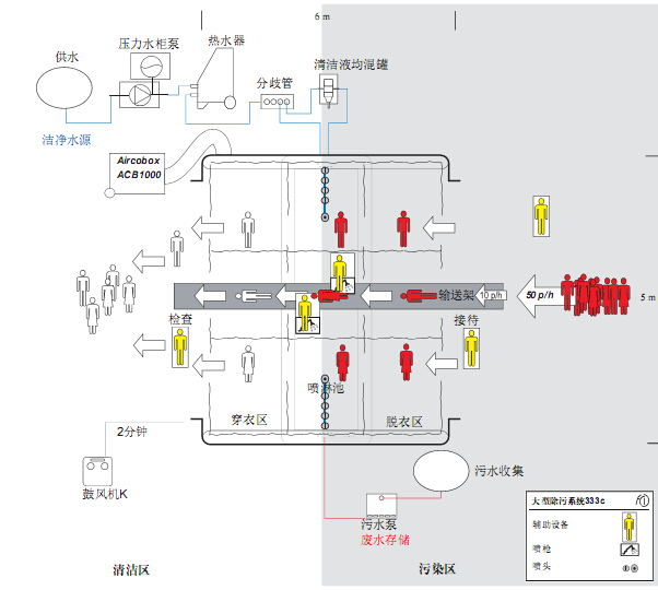 大型除污系统333C设计用于对三组人员同时进行除污。热空气和洁净水